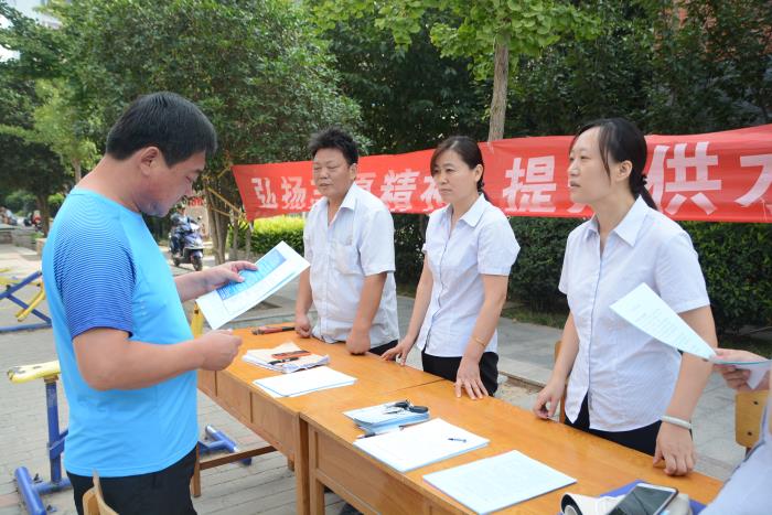 入夏以來,居民用水量增大,用水各種問題也隨之而來,為了給廣大居民日常生活用水排憂解難,使居民放心用水、輕松用水。濮陽市自來水公司持續(xù)開展供水服務(wù)進社區(qū)活動,活動中,供水志愿者與社區(qū)居民零距離接觸,耐心解答居民關(guān)心的水價、水質(zhì)、水壓、抄表、收費等問題,同時向現(xiàn)場來訪的居民演示了檢測水質(zhì)的方法,填寫了供水服務(wù)征求意見表,居民可對供水壓力、水質(zhì)、抄收員服務(wù)態(tài)度、供水設(shè)施維修搶修等進行評價。據(jù)了解,本次活動共計發(fā)放用戶服務(wù)指南93冊,《河南省城市供水管理辦法》宣傳冊55本,填寫供水服務(wù)征求意見表32張,均為滿意。