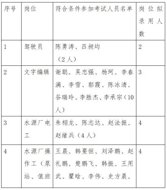 按照濮陽市自來水有限公司網(wǎng)站公示的崗位招聘條件,對應(yīng)聘人員進(jìn)行了嚴(yán)格篩選,現(xiàn)將符合條件參加考試人員名單公示如下: