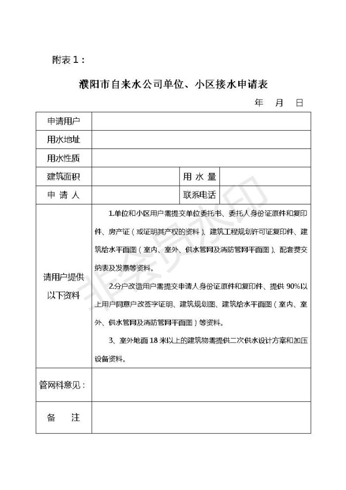 濮陽市自來水公司單位、小區(qū)接水申請(qǐng)表